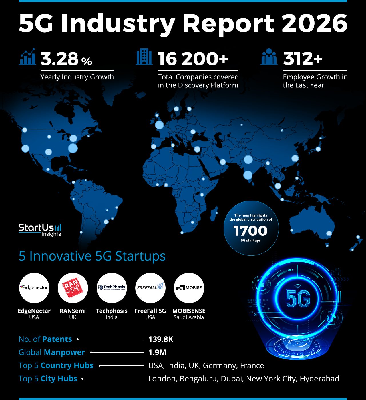 The USA, India, the UK, Germany, and France are the top country hubs in terms of location. Further, London, Bengaluru, Dubai, New York City, and Hyderabad are the top cities in the ecosystem. These hubs are important for 5G development as they assist research, network rollout, and business adoption.