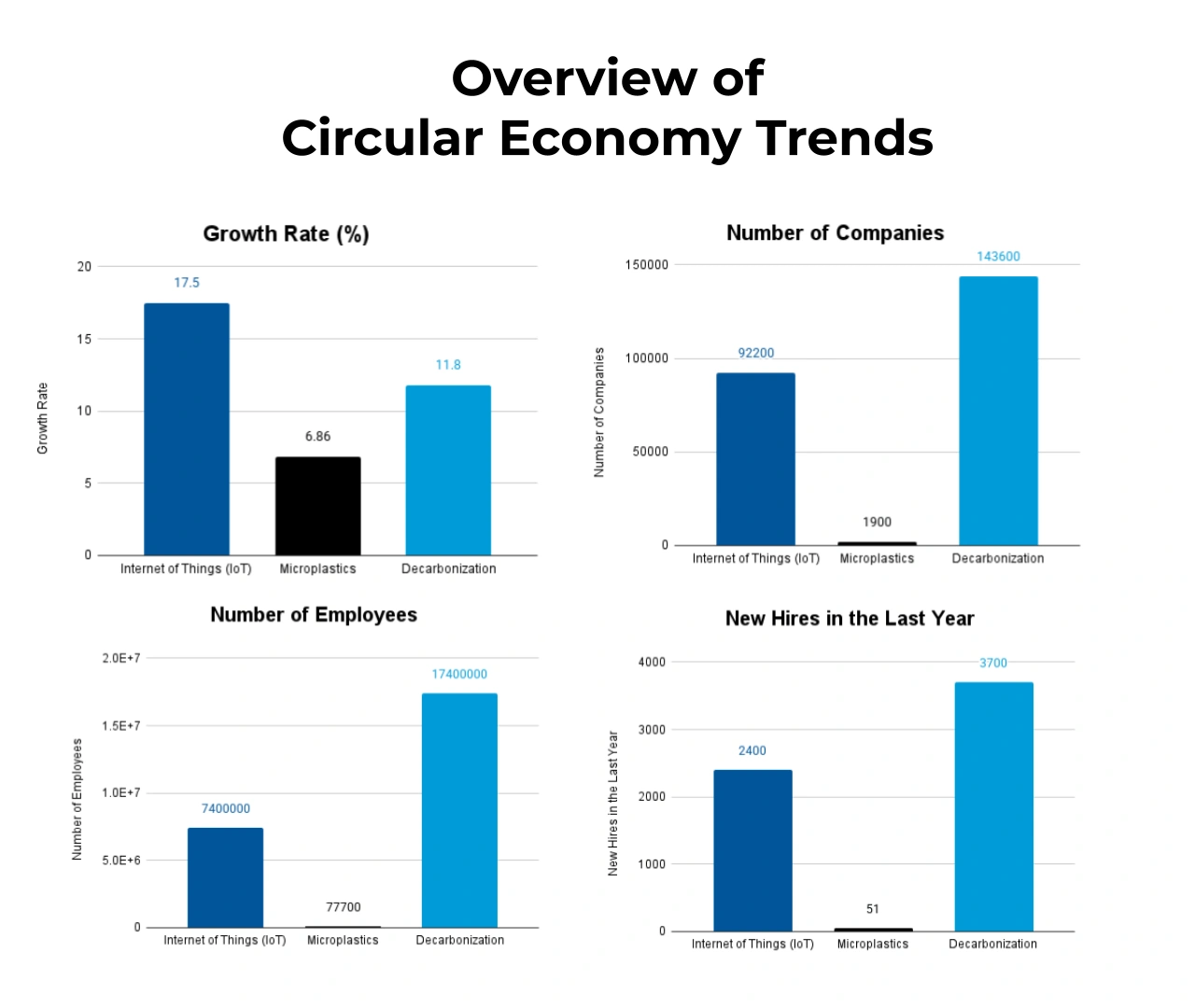 For this report, we focused on the evolution of the circular economy over the past 5 years, utilizing our platform’s trend intelligence feature. Key data points analyzed include: