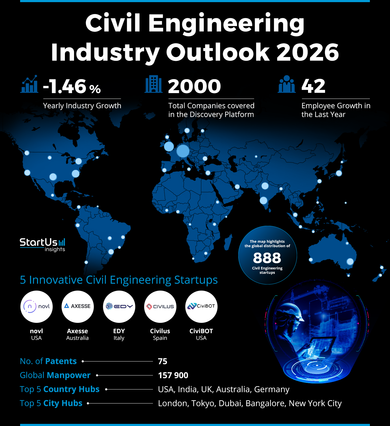 This civil engineering industry outlook draws on the StartUs Insights Discovery Platform to map 9M+ companies, 25K+ technologies and trends, and 190M+ patents, news articles, and market reports. The scope is deliberately asset and workflow-aware and centers on capital program delivery, design-to-build handoffs, project controls, and materials decarbonization, rather than treating civil engineering as generic construction services.
