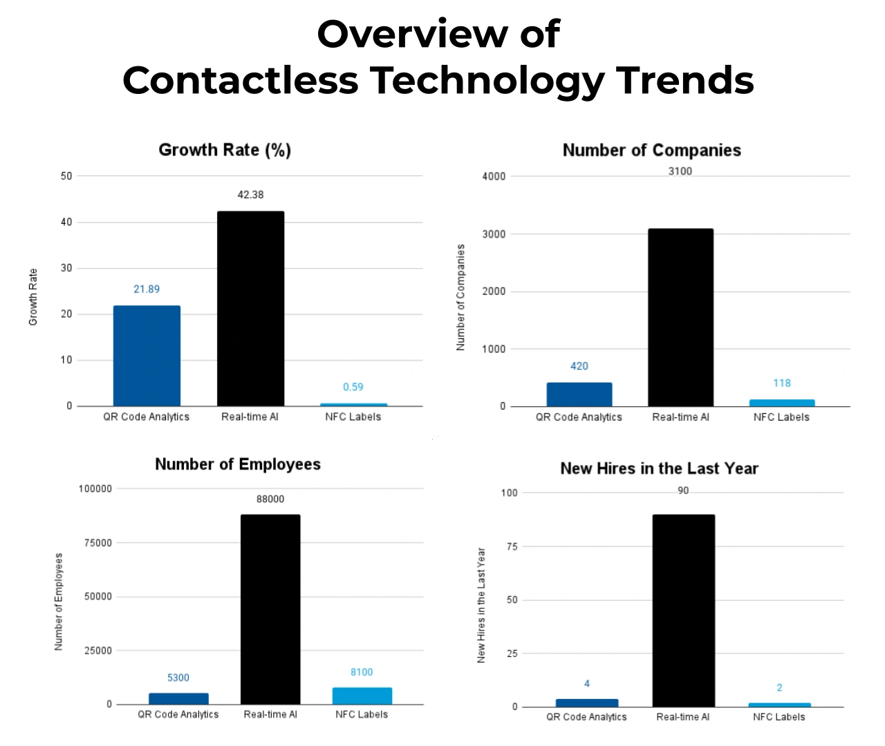 • Real-time AI trend involves 3100 companies applying instant data processing to fraud detection, authentication, and dynamic transaction approvals in contactless systems. The segment employs 88 000 workers and added 90 employees last year. It has an annual trend growth rate of 42.38%, which indicates the adoption of AI-driven decision-making in contactless environments.