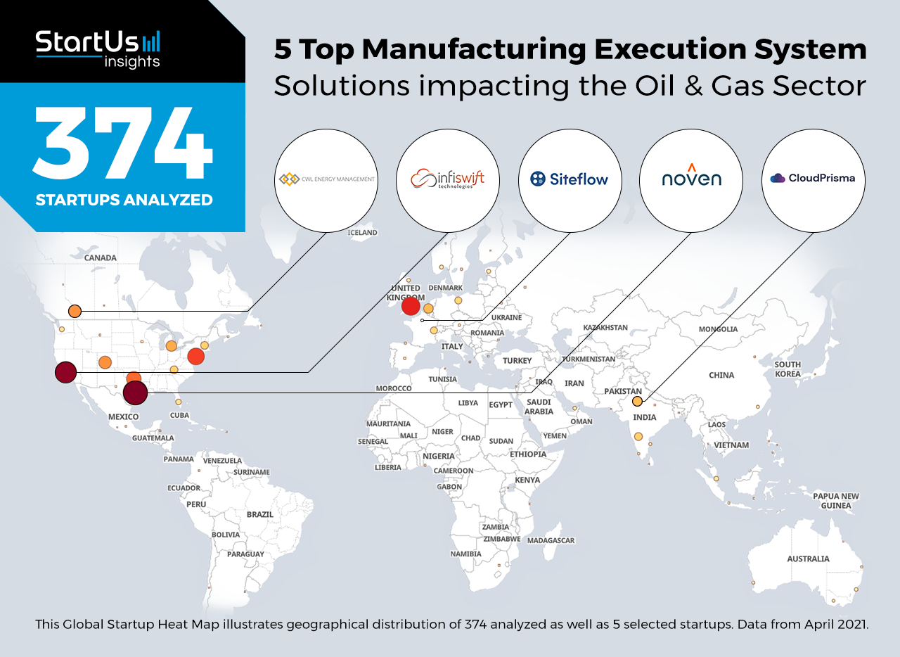 The Global Startup Heat Map below reveals the distribution of the 374 exemplary startups & scaleups we analyzed for this research. Further, it highlights 5 oil & gas startups that we hand-picked based on criteria such as founding year, location, funding raised, and more. You get to explore the solutions of these 5 startups & scaleups in this report. For insights on the other 369 MES solutions, get in touch.
