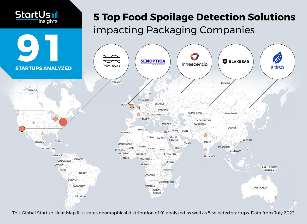 Out of 91, the Global Startup Heat Map highlights 5 Top Food Spoilage Detection Solutions