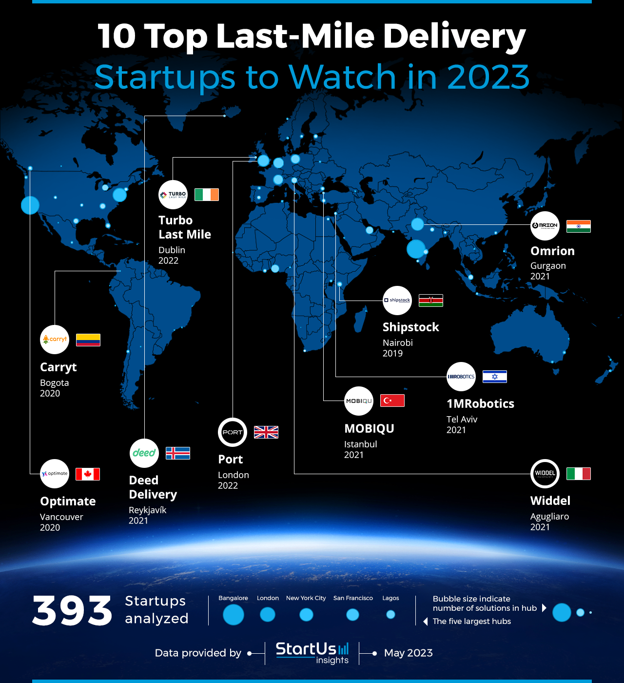 As the world’s largest resource for data on emerging companies, the SaaS platform enables you to identify relevant technologies and industry trends quickly & exhaustively. Based on the data from the platform, the Top 5 Last-Mile Delivery Startup Hubs are in Bangalore, London, New York City, San Francisco & Lagos. The 10 hand-picked startups highlighted in this report are chosen from all over the world and develop solutions for on-demand delivery, maximum asset utilization, better collaboration, and smart lockers.