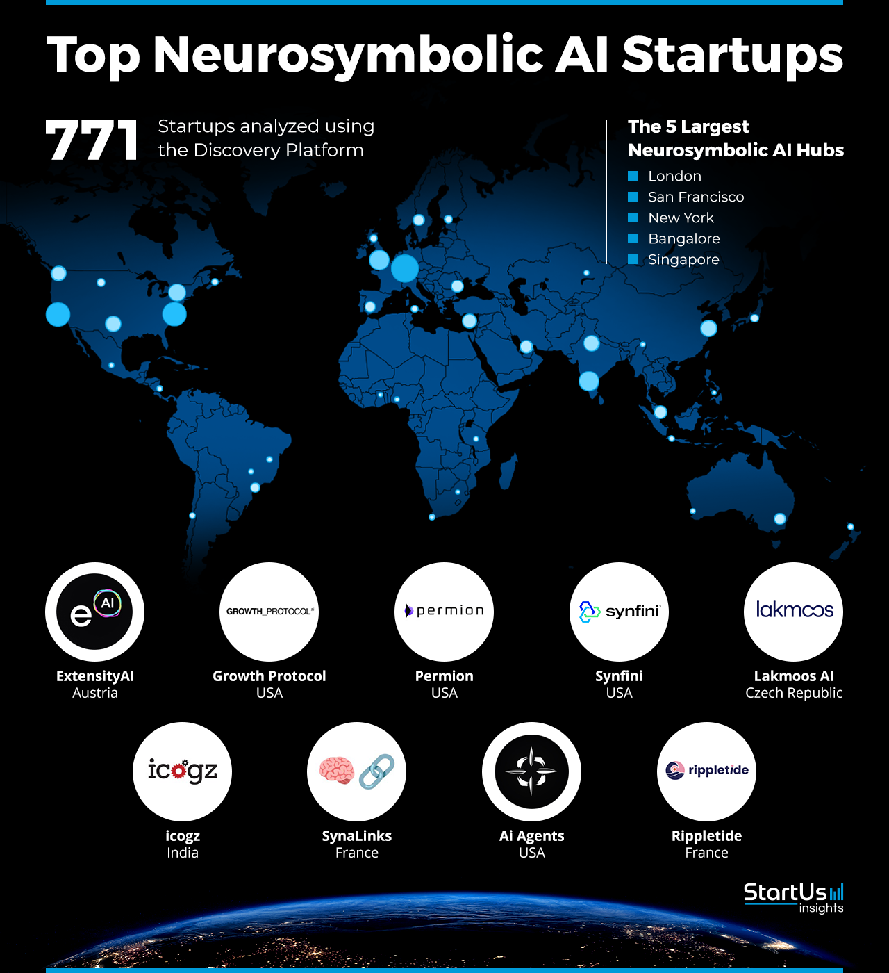 Through the Big Data & Artificial Intelligence (AI)-powered StartUs Insights Discovery Platform, covering over 7M+ startups, 20K+ technology trends, plus 150M+ patents, news articles & market reports, we identified top neurosymbolic AI startups.