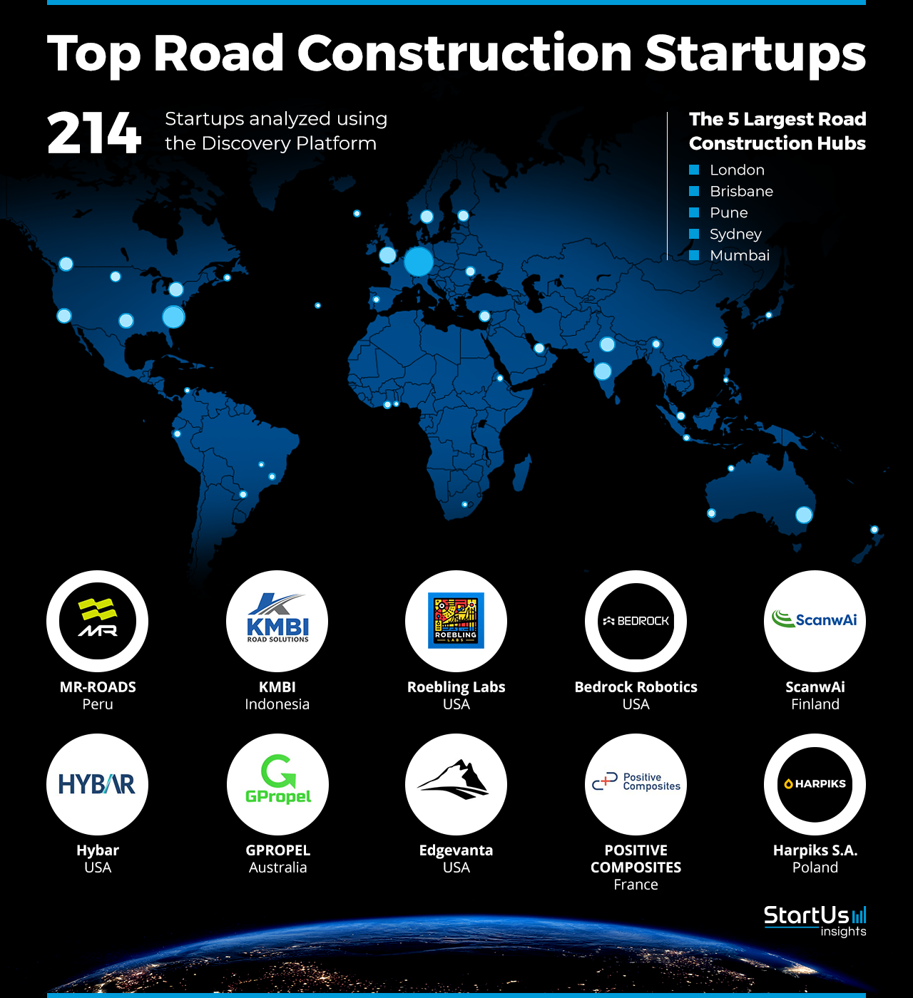 Through the Big Data & Artificial Intelligence (AI)-powered StartUs Insights Discovery Platform, covering over 7M+ startups, 20K+ technology trends, plus 150M+ patents, news articles & market reports, we identified the top road construction startups.