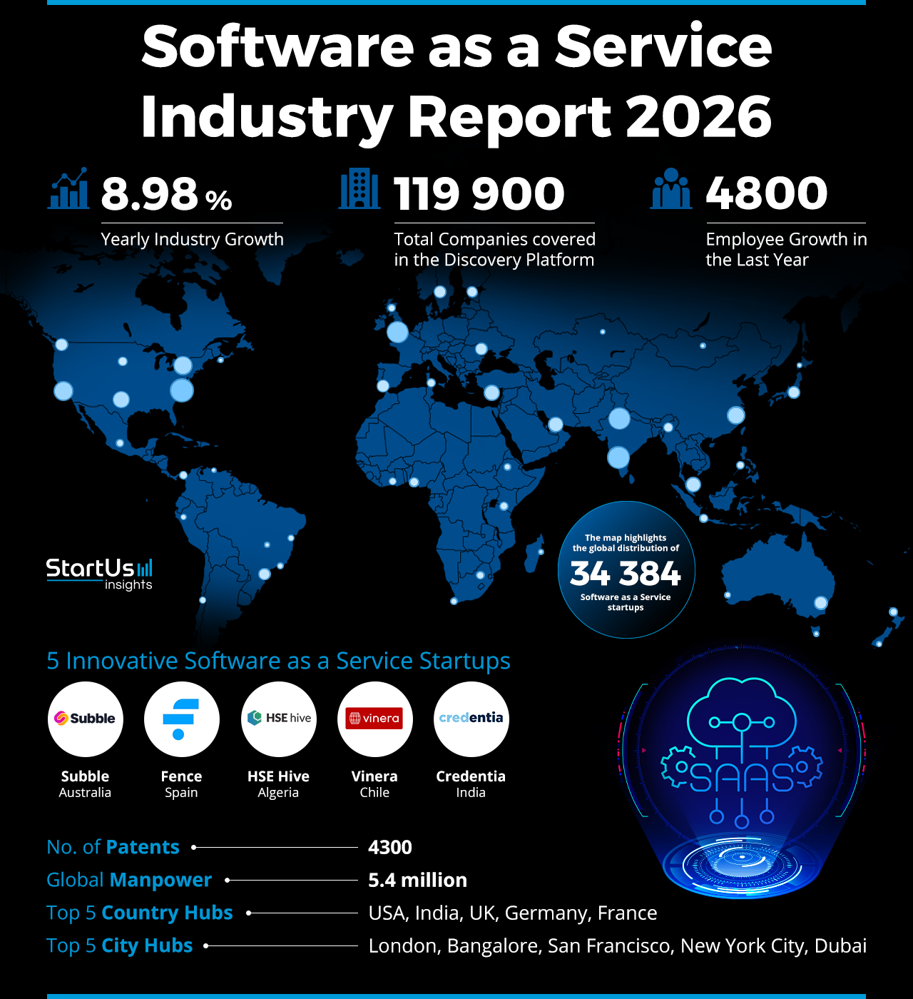 This SaaS outlook is built on insights from the StartUs Insights Discovery Platform, which tracks ~9M companies, 25K+ technologies and trends, and 150M+ patents, news articles, and market reports. For this report, we analyzed the last five years of market signals across 119.9K SaaS companies (including 34.3K startups) and tracked momentum through workforce indicators (~5.4M professionals; +4.8K added last year), innovation activity (~4.3K patents; ~13.7K grants; 13.23% yearly patent growth), and capital formation (110.4K+ funding rounds; 65.5K+ investors; USD 19.1M average round), complemented by external market sizing and capital market benchmarks.