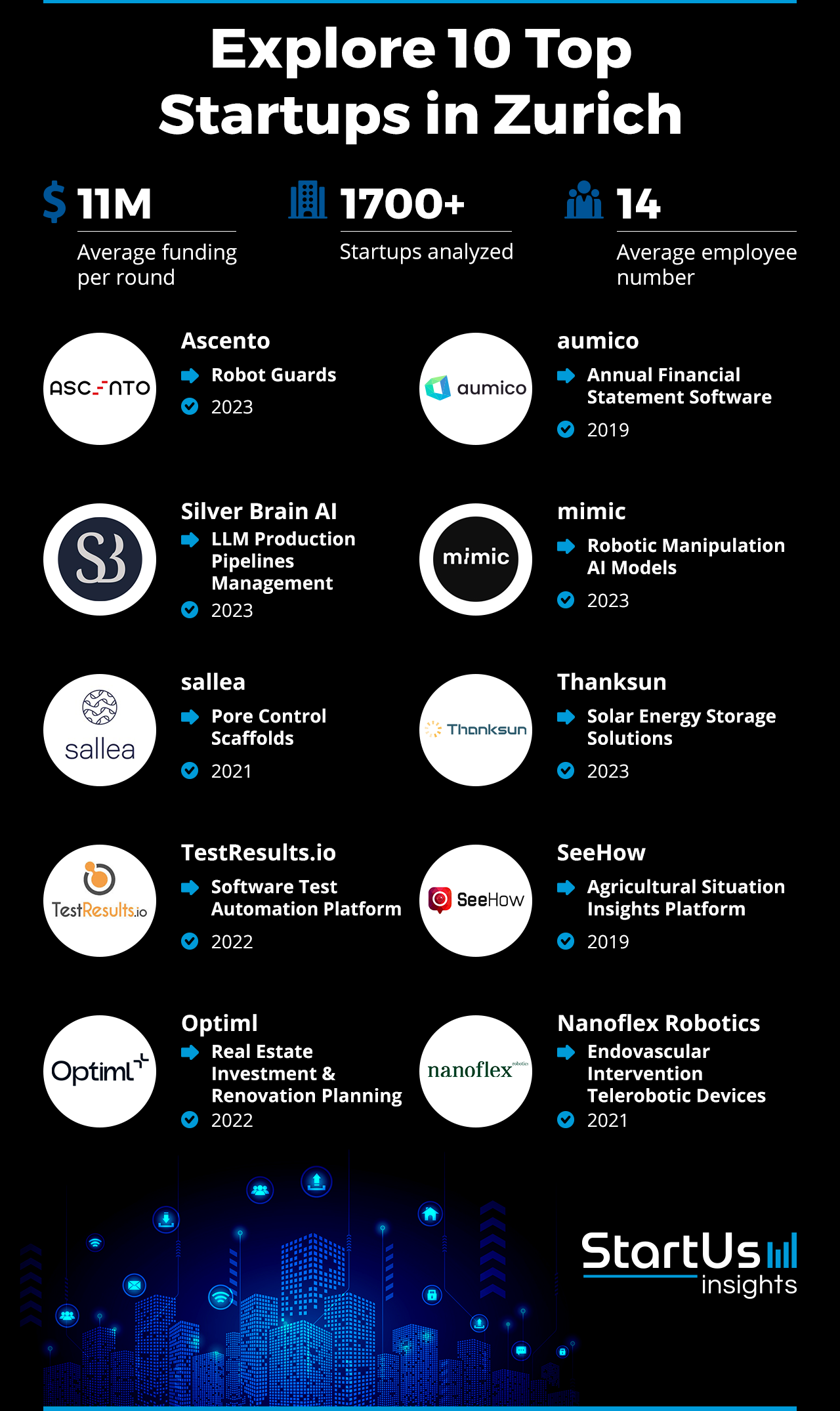 We rely on innovation data from StartUs Insights’ Discovery Platform, which tracks 4.7 million startups, scaleups, and tech companies worldwide. We filtered by location, founding year, technology readiness, and employee count, reducing the pool to 1769 startups in Zurich. From this pool, we identified 10 standout startups by analyzing funding information and our proprietary popularity metric, Signal Strength. Signal Strength evaluates a company’s influence within the global innovation ecosystem. Let’s take a look!