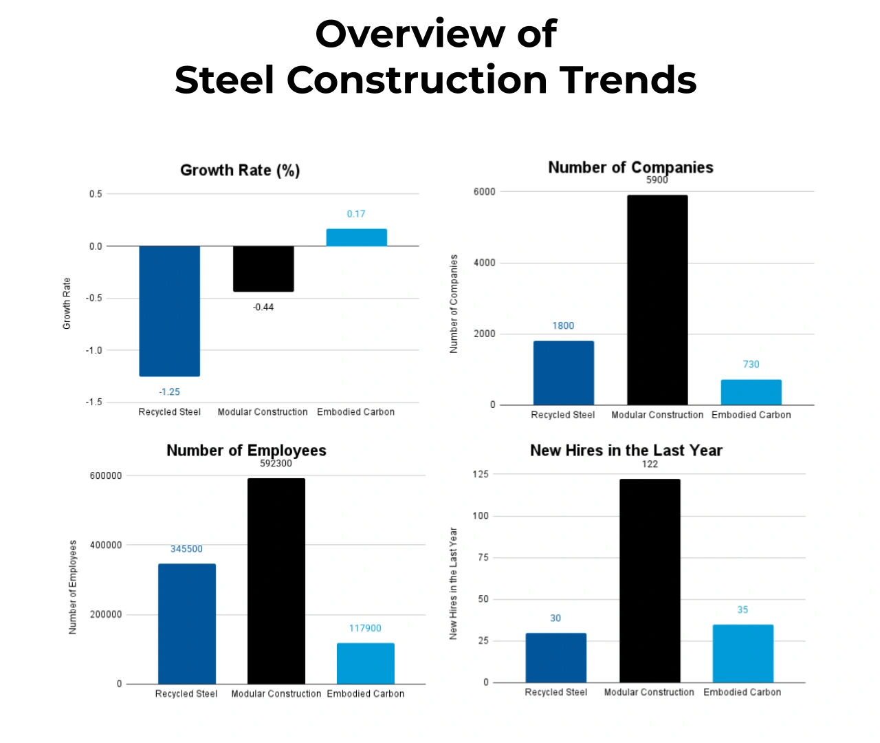 For this report, we focused on the evolution of steel construction over the past 5 years, utilizing our platform’s trend intelligence feature. Key data points analyzed include: