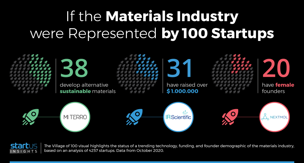 This report gives you a clear-cut overview of what the materials industry looks like represented by 100 global startups. More specifically, you get answers to some of your most burning questions in the Village of 100 Startups graphic below. The graphic highlights how many startups develop alternative sustainable materials, how many raised more than $1M, and how many have female founders. Additionally, you get to discover three emerging material startups to watch.